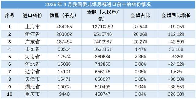 從進口省份來看,2025年4月份我國嬰兒紙尿褲進口金額前5的省份分別為上海市、浙江省、廣東省、山東省和河南省。